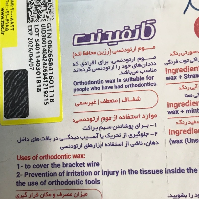 طراحی مناسب برای قرارگیری راحت روی براکتها محافظت از لثهها و بافتهای نرم دهان دارای طعمهای دلپذیر ساختار ایمن استفاده آسان و سریع جلوگیری از ساییدگی براکتها و مینای دندان دارای انعطافپذیری و شفافیت بدون بو مواد طبیعی و سازگار با بدن تسکین درد و ناراحتی