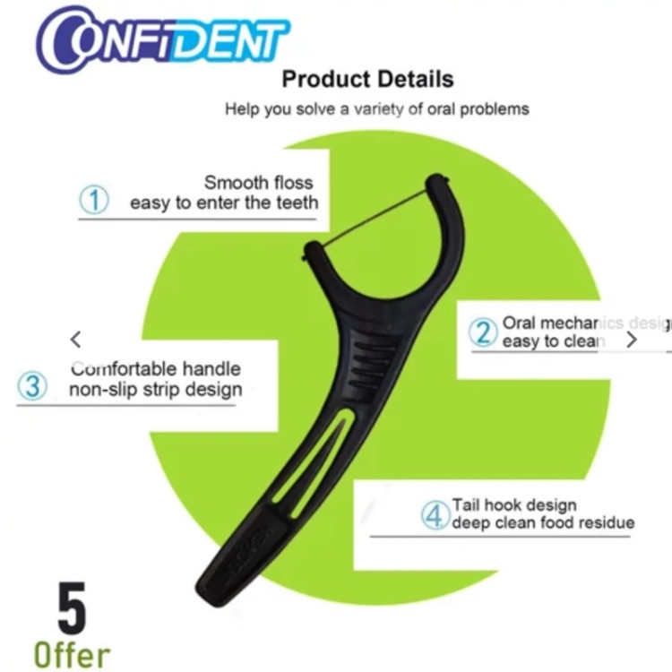 نخ دندان خلالی ذغالی کانفیدنت مناسب انواع دندان و یک تمیز کننده بسیار عالی برای سطوحی از دندان که مسواک قادر به نفوذ و تمیز کردن آن ها نیست، می باشد. این محصول، به دلیل ساخت و ظاهر هوشمندانه و داشتن ذغال فعال و تماس نداشتن دست با نخ دندان از نخ دندان های معمولی دیگر بهداشتی تر می باشد و همچنین قسمت پایین این نخ دندان خلالی، از نخ جدا و تبدیل به یک خلال ، برای خلال بین دندانی می گردد. نخ دندان خلالی کانفیدنت علاوه بر اینکه مناسب دندان های زیبا شما هستند برای دندان هایی که ارتودنسی، کامپوزیت، لامینت و زیرکونیوم شده اند نیز بسیار کارآمد می باشد.