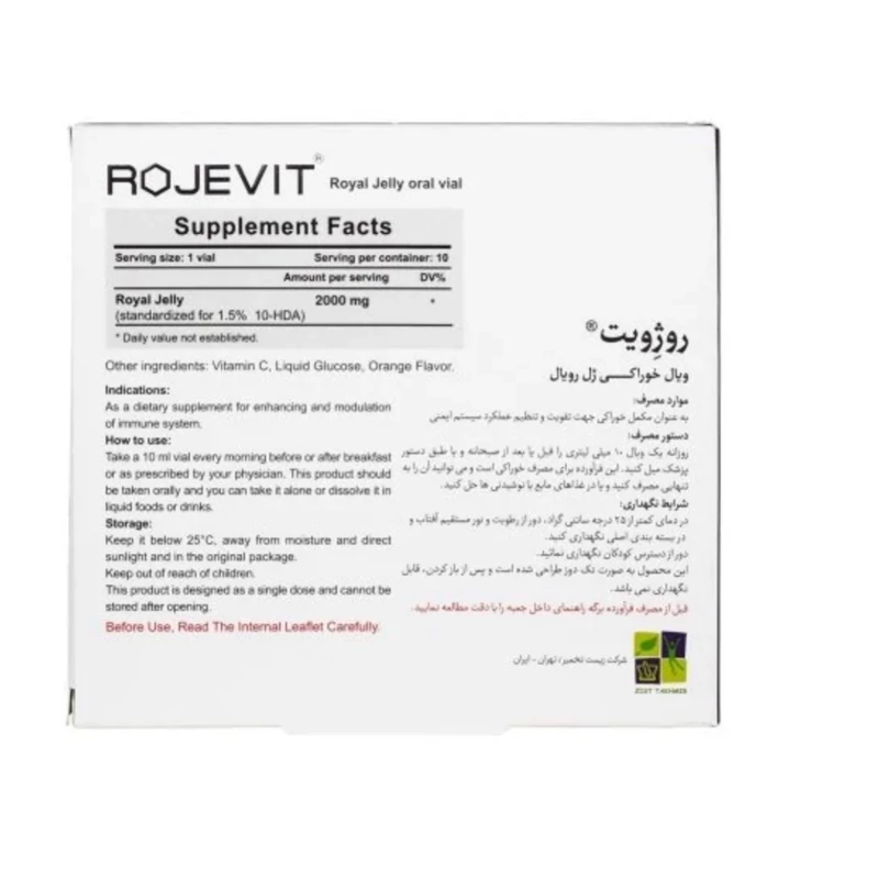 روژویت، کمک به تقویت و تنظیم عملکرد سیستم ایمنی روژویت ویال خوراکی رویال ژلی ، موثر در بهبود قوای جسمی و ذهنی و کاهش ضعف و خستگی ویال رویال ژلی، کمک به حفظ سلامت سیستم قلبی و عروقی دارای خواص آنتی اکسیدانی و ضدالتهابی rojevit، کمک به بهبود اشتها در افراد مبتلا به بی اشتهایی عصبی و افراد دچار سوء تغذیه موثر در بهبود عوارض جسمی ناشی از یائسگی