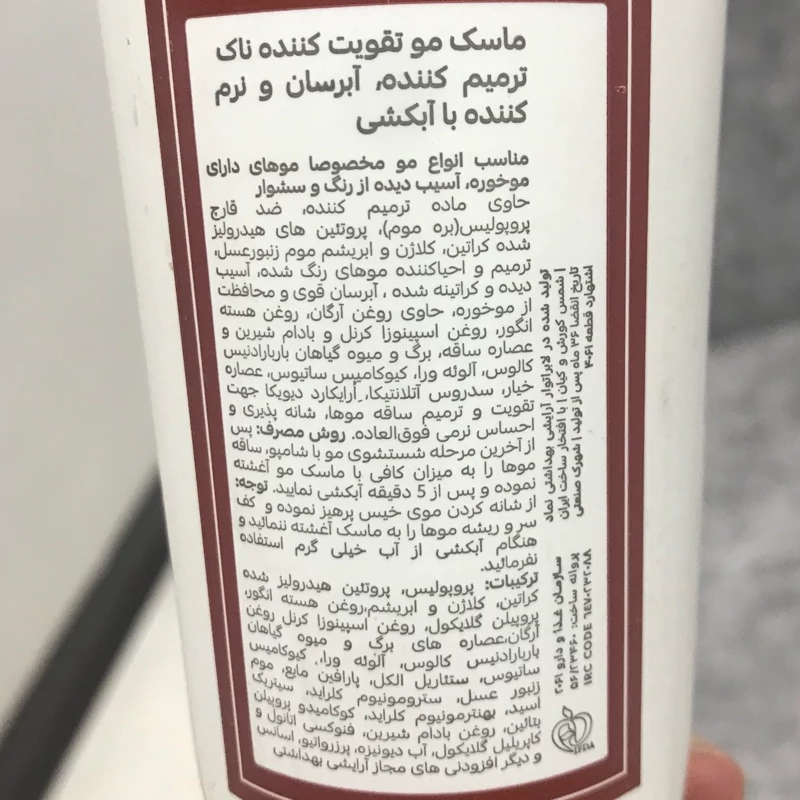 حاوی ماده ترمیم کننده , ضد قارچ پروپولیس (بره موم) , پروتئین های هیدرولیز شده کراتین , کلاژن و ابریشم موم زنبور عسل ,ترمیم و احیا کننده مو های رنگ شده , آسیب دیده و کراتینه شده , آبرسان قوی و محافظت از موخوره.