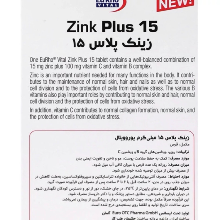 حاوی زینک به فرم سیترات مزیت فرم سیترات: دارای عارضه گوارشی کمتر نسبت به برخی از فرم های دیگر زینک کمک به تقویت سیستم ایمنی کمک به حفظ سلامت پوست، مو و ناخن کمک به تقویت اشتها در نوجوانان کمک به ترمیم زخم Zinc plus 15 حاوی ویتامین های گروه B و ویتامین C