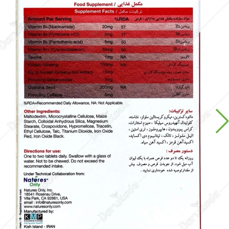 قابل استفاده برای کمک به افزایش استقامت در ورزشکاران دابل بول، دارای اثرات کمکی در کاهش خستگی مفرط و بیحالی، بهبود تمرکز و ادراک مناسب برای استفاده جهت رفع علائم سندرم خستگی مزمن فاقد گلوتن، نشاسته، سویا، ذرت، مخمر افزوده شده، گندم، شکر و رنگهای مصنوعی انرژیزا برای کمک به افزایش سطح انرژی و کاهش خستگی مزمن دابل بول، حاوی ترکیبی از ویتامینهای گروه B، تائورین، جینسینگ کرهای و گوارانا