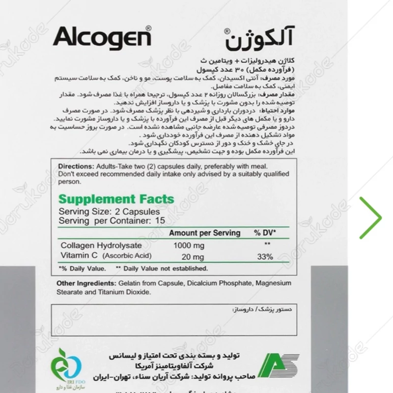 * آلکوژن، حاوی کلاژن هیدرولیز شده و ویتامین سی