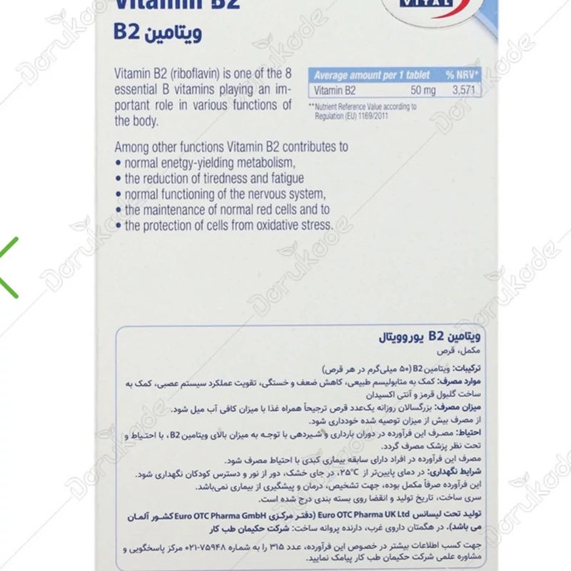 مکمل تغذیهای ب2 یوروویتال تامینکننده نیاز روزانه بدن به ویتامین B2