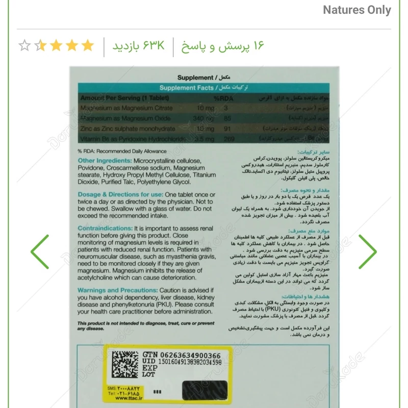 حاوی ویتامین B6، زینک و ماده معدنی منیزیم (منیزیم اکساید + منیزیم سیترات)