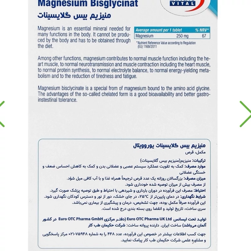 منیزیم بیس گلیسینات، با سرعت جذب بالا و حداقل عوارض گوارشی منیزیم بیس گلیسینات یوروویتال، دارای 250 میلی گرم منیزیم المنتال در هر دونه