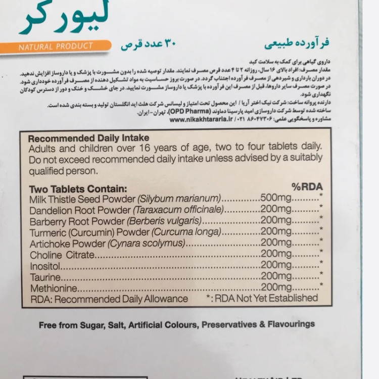 مکمل گیاهی 60 عددی با ترکیباتی مانند خار مریم، کنگر فرنگی، زردچوبه و زرشک؛ پشتیبان سلامت کبد، سمزدای کبد و کنترل کبد چرب