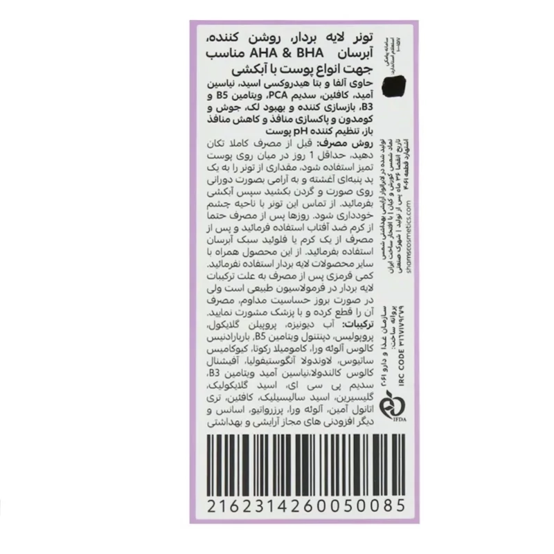 حاوی BHA، AHA و نیاسین آمید برای لایه برداری ملایم و روشن سازی پوست